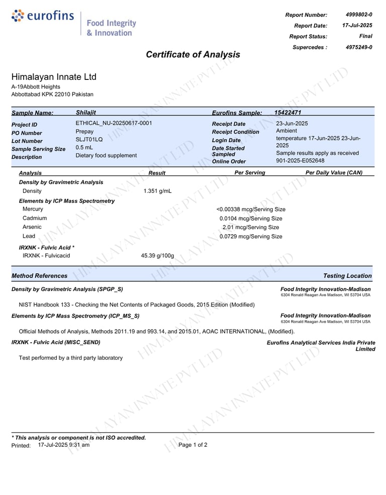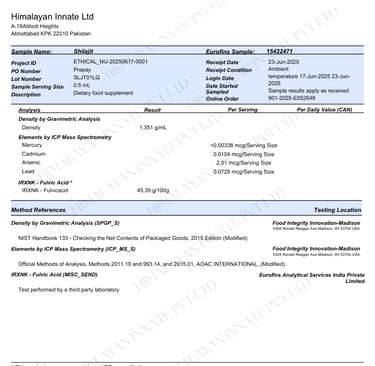 Every batch of Golden Shilajit is tested by Eurofins Laboratories USA – Madison, using the ICP-MS-S method, the world’s most advanced standard for heavy metal and fulvic acid analysis. This testing follows WHO and U.S. supplement safety requirements, ensuring global compliance.