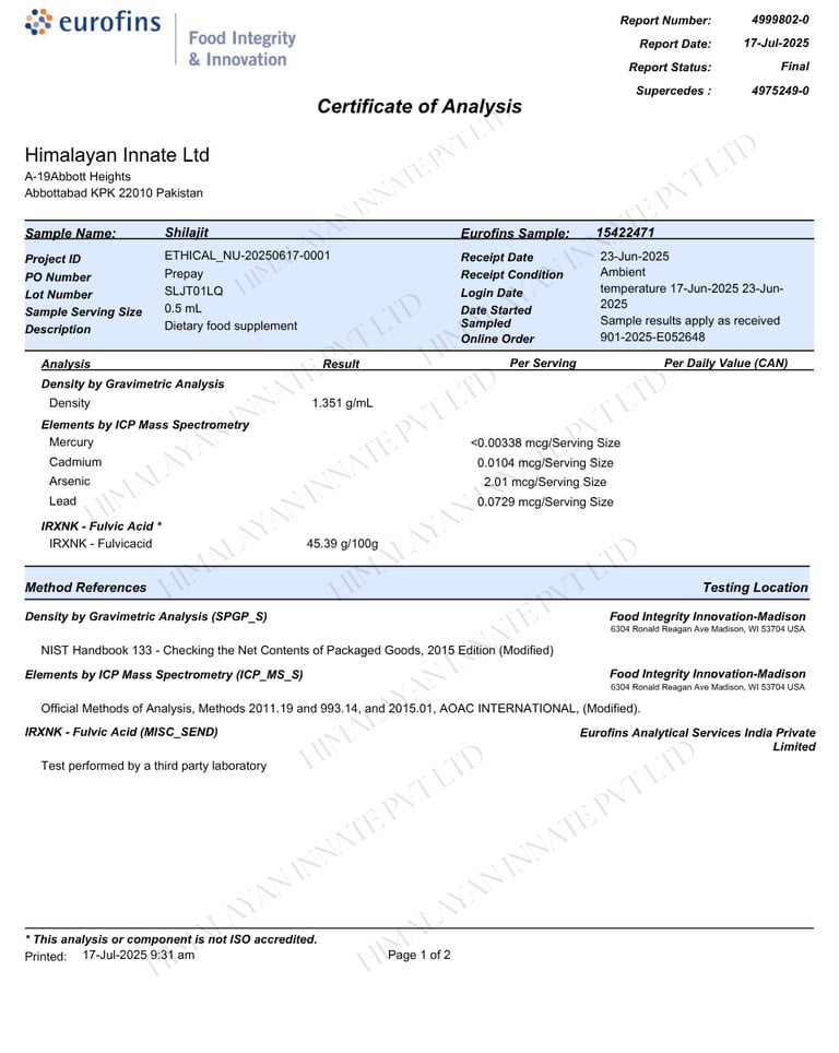 Every jar of Golden Shilajit Pakistan is tested for fulvic acid concentration through Eurofins-certified methods, ensuring consistency and authenticity.